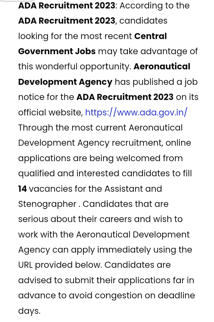 Aeronautical Development Agency യിൽ വിവിധ ഒഴിവിലേക്ക് അപേക്ഷ ക്ഷണിച്ചു